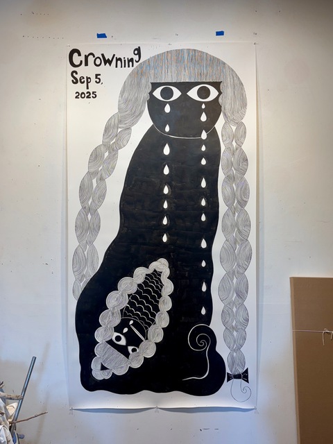 Sexpot was produced by drawing an outline with charcoal on two sheets of drop cloth, which were then hand-sewn together, trimmed, and stuffed with fiberfill and black foam. I then painted her with acrylic paint, and adorned her with earrings made from papier-mâché and metal leaf. She is over eight feet tall, and was inspired by Neolithic and ancient Greek artifacts.
