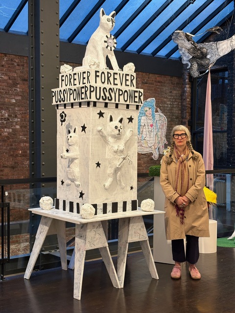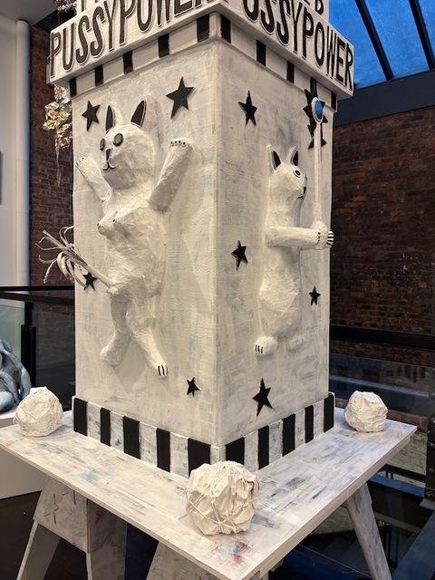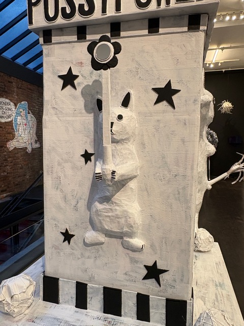 Sexpot was produced by drawing an outline with charcoal on two sheets of drop cloth, which were then hand-sewn together, trimmed, and stuffed with fiberfill and black foam. I then painted her with acrylic paint, and adorned her with earrings made from papier-mâché and metal leaf. She is over eight feet tall, and was inspired by Neolithic and ancient Greek artifacts.