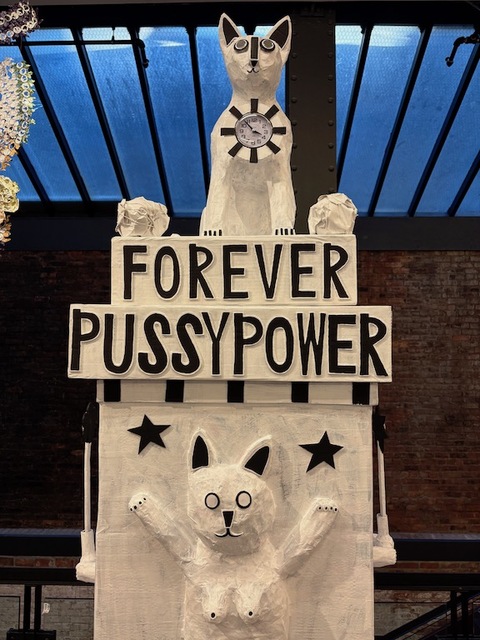 The sentence “someday all of this will be over” was the title of a site-specific work I created for Pioneer Works in 2021. It consisted of a hand-sewn banner hung from a large cone-shaped tent made from repurposed plastic drop cloth. Housing three videos playing simultaneously on three different TV monitors, the videos depicted various non-narrative fragmented moments I had collected on my smartphone over many years. The piece had to do with the pandemic and the many issues surrounding it that I was processing at the time. Notions of separation, death, and shelter all expanded in their meaning and scope for me during this unprecedented period of mandatory lockdown, which formed the basis for a new personal lexicon that I carried forward into my current unsheltered life. Like a creative clock reset to 12:00, which for 60 seconds marks either a new day beginning or the ending of one, the pandemic constituted a defining moment in time both for me and the world we live in, dividing everything before and everything after. Luckily, I found an inspired space in which to revisit this 7-word sentence. The large-face clock in the main room of the 96th Street branch of the New York Public Library has been the object of my affections for a long time and seemed like a good space in which to create a site-specific piece composed of a series of seven personalized clocks, each displaying one word from this epigram. Almost all of the materials that make up the piece were collected over a period of months and reflect a personal relationship. Many of the cardboard boxes that formed the underlying structure, which I painted over, came from my job at the Metropolitan Museum of Art—as well as discarded frozen food boxes and coffee cups from my studio and balloons from previous art projects of mine. The only unpainted items in the piece are my father’s empty pill bottle and the first photo ever taken of me in the hospital moments after I was born. Over time the meaning of this phrase that spans the piece has shifted for me as we have moved further away from the pandemic. The words now embrace the war in Ukraine, and more recently, the Palestinian-Israeli conflict, as well as climate destruction and many other epidemics that are currently plaguing people in our society. Maybe these words will inspire some comfort because nothing, truly, is forever. Maybe not even time.